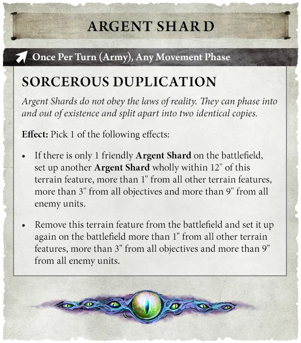 Cada Fragmento Argento es un fragmento de una de las legendarias Torres Plateadas de Tzeentch, ominosos monolitos flotantes que se manifiestan en pares. Como con la mayoría de los elementos de terreno de facción, colocarás uno en el paso correspondiente de la fase de despliegue, y su Simulacro Plateado se manifestará después de que ambos ejércitos se hayan desplegado.
