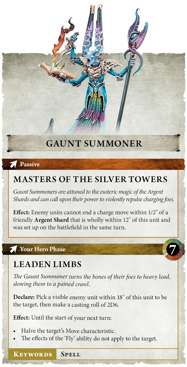 Como Maestros de las Torres Plateadas, no debería sorprender que los Invocadores Demacrados estén en sintonía con los Fragmentos Argentos, y cuando están cerca pueden impedir que las unidades enemigas finalicen movimientos de carga a menos de 1,27 cm de los Fragmentos, asegurando que permanezcan intactos. Los Invocadores Demacrados a pie también pueden causar más problemas a sus enemigos, otorgándoles Extremidades Plomodas y reduciendo su movimiento y capacidad de vuelo.