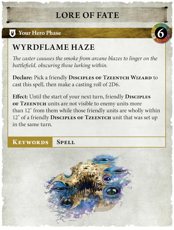 Los Discípulos de Tzeentch tienen muchos otros hechizos en los que también querrán un poco de alcance adicional. El Saber del Cambio se siente igual en espíritu, pero Plegar Realidad y Transformado para Engendrar ahora hacen uso de unidades puestas en reserva por el rasgo de batalla Ilusiones Arcanas . El Saber del Destino conserva Portal Infernal y Escudo del Destino , este último te permite elegir un Guardián (5+) o restar 1 a las tiradas para golpear que tienen como objetivo a la unidad. El nuevo hechizo Bruma de Llama Wyrd te da aún más formas de meterte con tus enemigos, creando una burbuja alrededor de las unidades colocadas ese turno, que oscurece a las unidades cercanas de la vista. Si no puedes elegir entre los dos, simplemente conjura el Tomo de los Ojos, un Compendio de Conocimiento Oscuro que permite a un mago de los Discípulos de Tzeentch lanzar un hechizo gratuito de cualquiera de los dos saberes además del número de habilidades de Hechizo o Destierro que ya puede usar.