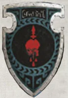El escudo de la Legio Laniaskara es un cráneo rojo sangre empalado por una lanza, apuntando hacia arriba, con sangre goteando.