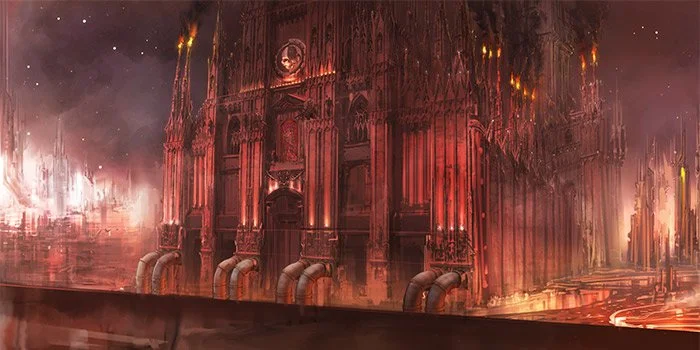 El vasto complejo de Mons Olympus era más una región que una ciudad colmena ya que alojaba fábricas, gigantescas refinerías, habitáculos de operarios, talleres y hangares de montaje, templos-máquina, tecnocapillas y relicarios mecánicos dedicados al Omnissiah. Esta amalgama de construcciones ocupaba miles de kilómetros cuadrados de la superficie de Marte. Era el hogar de miles de millones de tecnosacerdotes, adeptos y trabajadores. La estructura de mayor tamaño era el Templo de Todo Conocimiento, una pirámide inmensa de mármol negro y rosa coronada por una piedra azul centelleante. A poca distancia se encontraba el complejo de la Forja del propio Fabricador General, un edificio de casi su misma altura, cuyas refulgentes avenidas se habían construido como monumento del poder del Mechanicum. El santuario del Fabricador General estaba situado en una torre que sobresalía del extremo norte de la enorme forja.