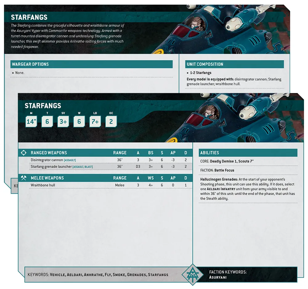 Finalmente, el Colmillo Estelar usa su velocidad y sus despiadadas armas Drukhari para aniquilar a la infantería de élite enemiga con potentes ráfagas de cañón desintegrador y lluvias de granadas. El lanzagranadas Colmillo Estelar incluso cumple una doble función como protección para tus Corsarios, ya que puede lanzar granadas alucinógenas para ocultar a los aliados del fuego enemigo desde el otro lado del campo de batalla.